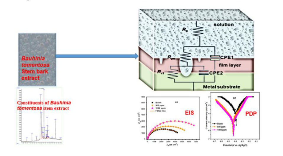 Plant-derived extracts serve as effective environmentally friendly inhibitors of corrosion because they are biodegradable, innocuous, and derived from renewable resources, rendering them a more friendly and sustainable substitute for harmful synthetic inhibitors. In this study, the inhibitive performance of Bauhinia tomentosa (BT) stem bark extract on low-carbon steel (L-CS) deterioration in 1 M hydrochloric acid was assessed via open circuit potential (OCP), potentiodynamic polarization (PDP), electrochemical impedance