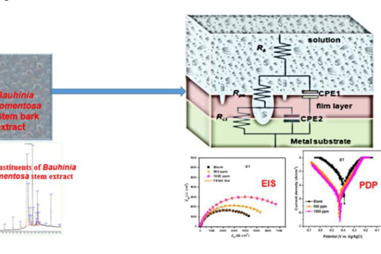 analysis identified organic compounds containing heteroatoms and pi-electron schemes, which enable robust interaction with the metal surface. An inhibition efficiency of up to 45% was achieved at 1000 ppm BT from PDP analysis, highlighting the prospect of BT extract as a corrosion inhibitor with modest performance in acidic environments.